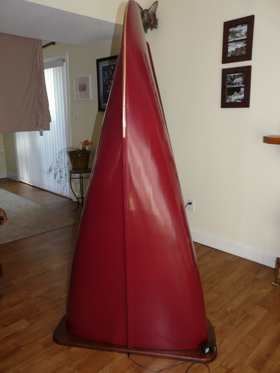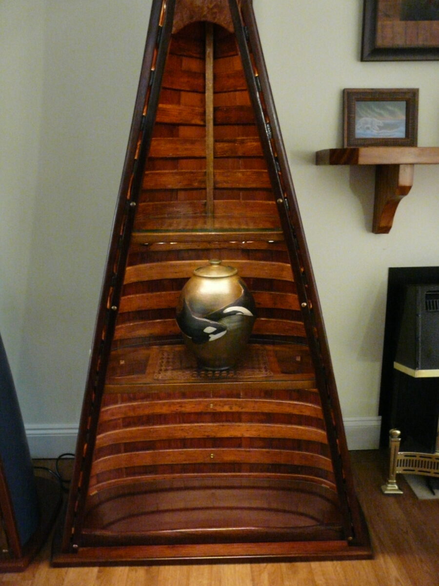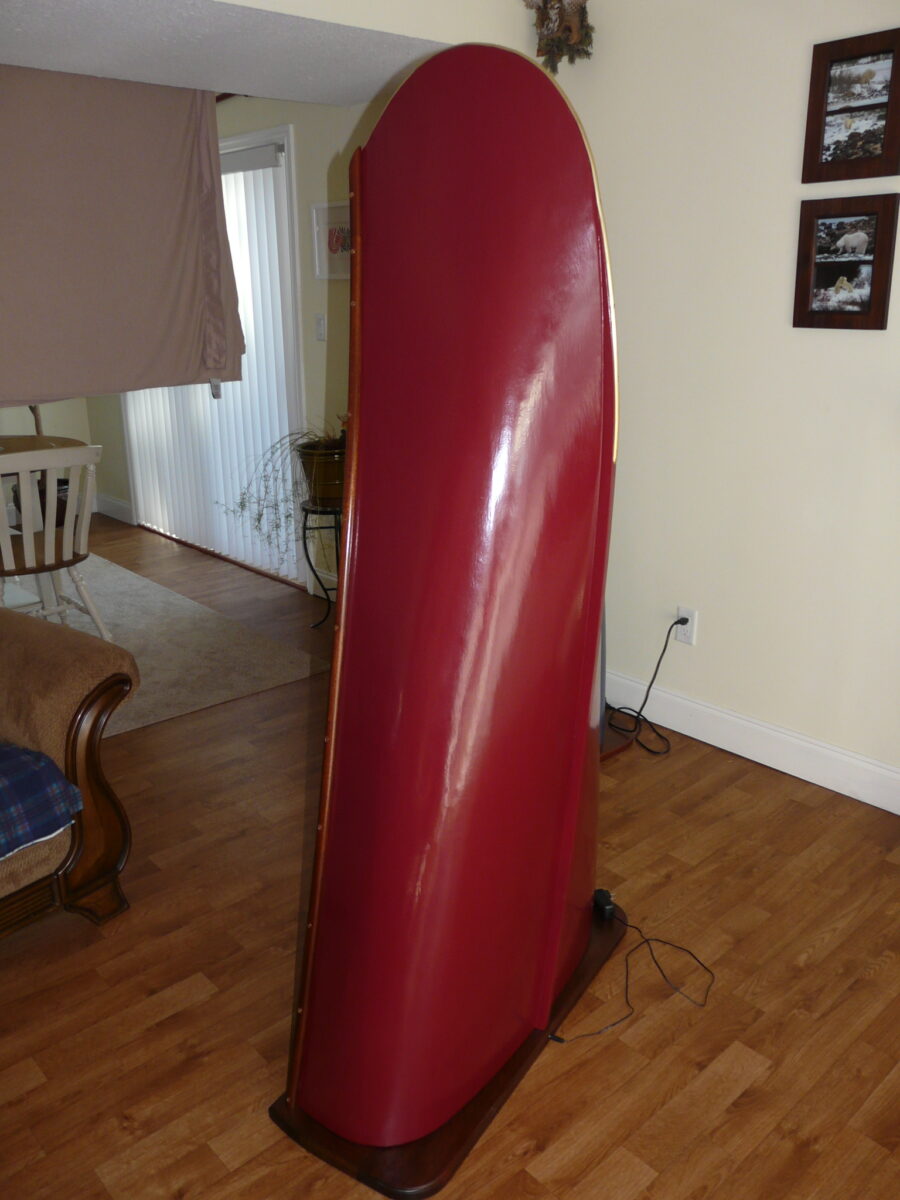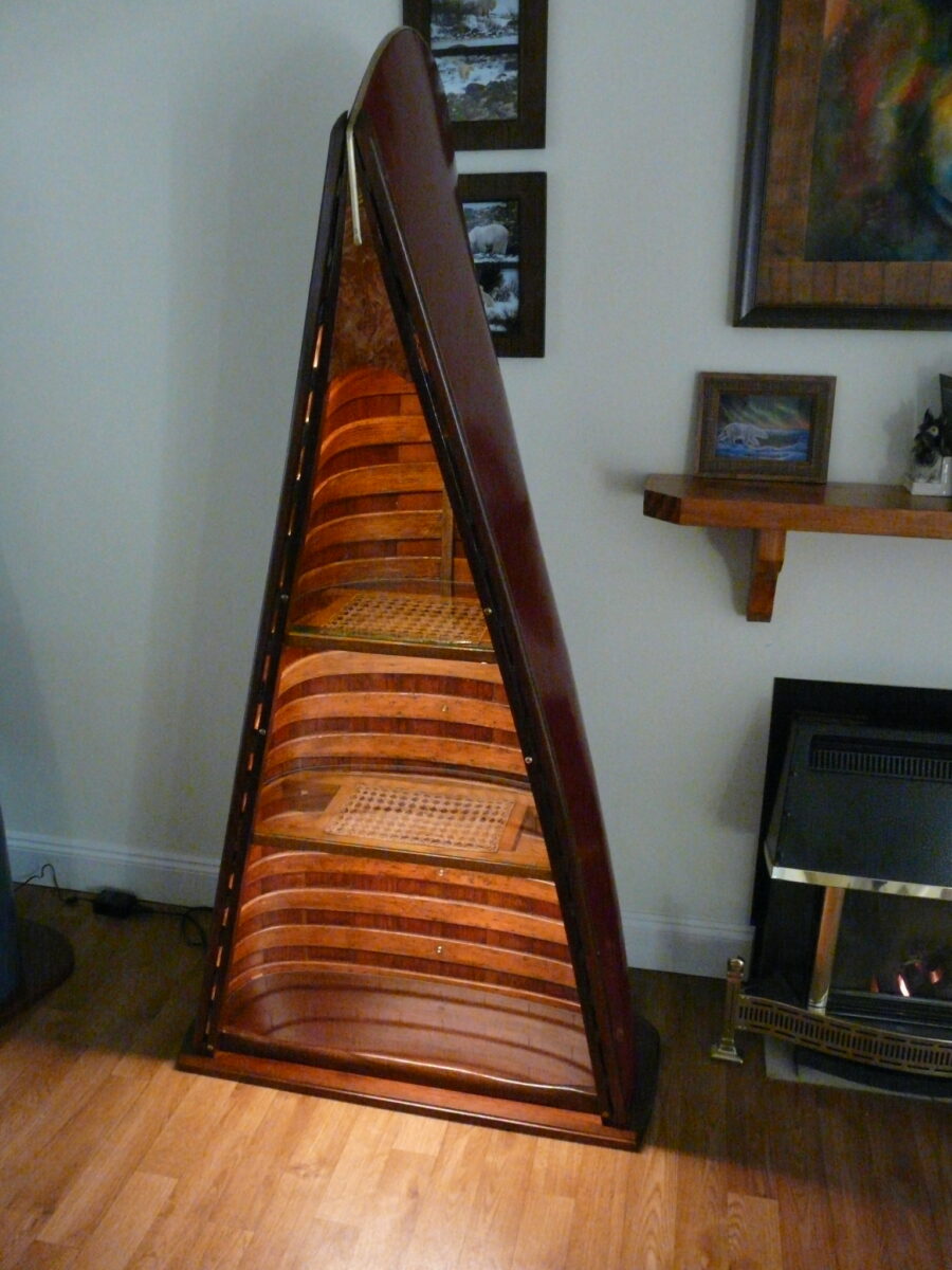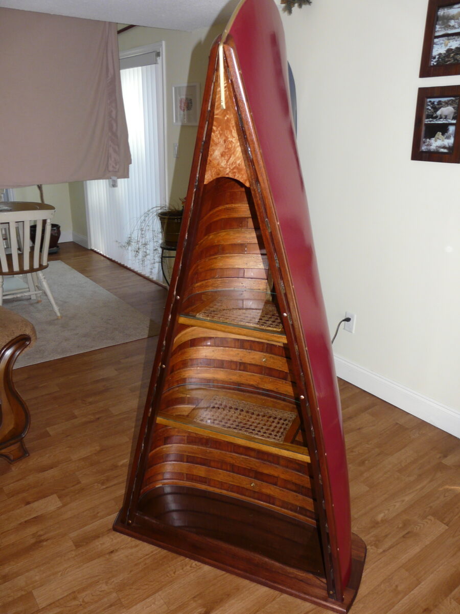 This display case is built from a restored heritage canoe and its elements. The maroon color is from a heritage pallet and the work done very closely resembles what is done when fully restoring a heritage canoe to paddle. Each feature is intact from the keel and stem bands to the cane seats used for shelving topped with 4mm beveled glass. The base is solid mahogany while the deck is a maple birds eye burl used to add some subtle but artistic flair. There is a dimmer controlled LED spotlight in the top that illuminates the top shelf with 2 inset LED bar lights for the lower 2 shelves, both are controlled from a single dimmer switch. The LED lights are controlled by touch sensitive switches connected to the top 2 bronze seat bolts, visible on the outside of the inwale.