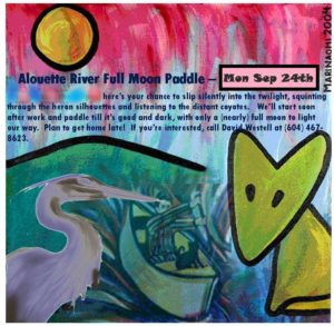 Are you free after work? Here’s your chance to slip silently into the night, squinting through the heron silhouettes and turning your ear to the nearby coyotes. We’ll start soon after work and paddle till it’s good and dark, with only a full moon to light the way. Plan to get home late! if you’re interested, let me know on or before Sep 21st at 4 pm. Call or email Dave W 604-467-8623 westell@shaw.ca